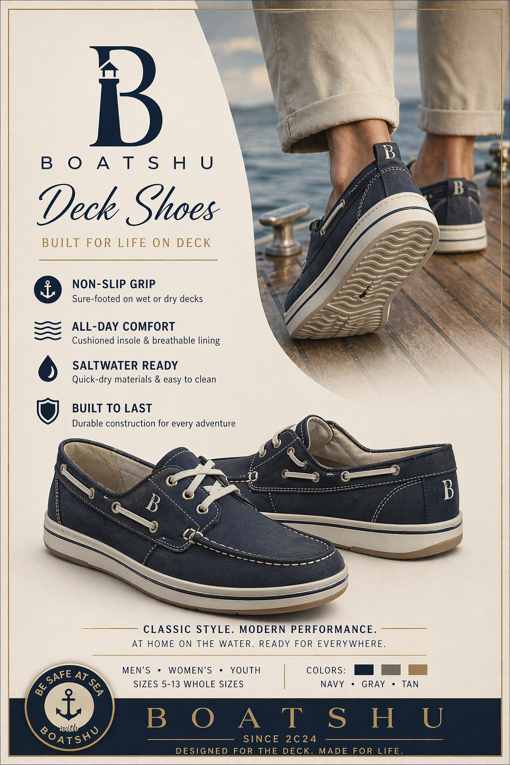BOATSHU Deck Shoes — Built for life on deck. Non-slip grip, all-day comfort, saltwater ready, built to last. Available in Navy, Gray, Tan.